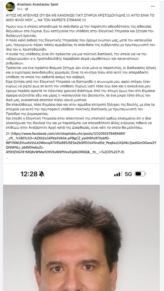 Ο ιδιοκτήτης του Κέντρου δεξιώσεων στα Λύμπια για το οποίο υπήρξε δημόσια αντιπαράθεση μετά την έκθεση της Ελεγκτικής Υπηρεσίας με ανάρτηση του σήμερα ισχυρίζεται πως ο βουλευτής Χρίστος Χριστοφίδης, τον απείλησε επειδή στήριξε προεκλογικά τον Νίκο Χριστοδουλίδη.