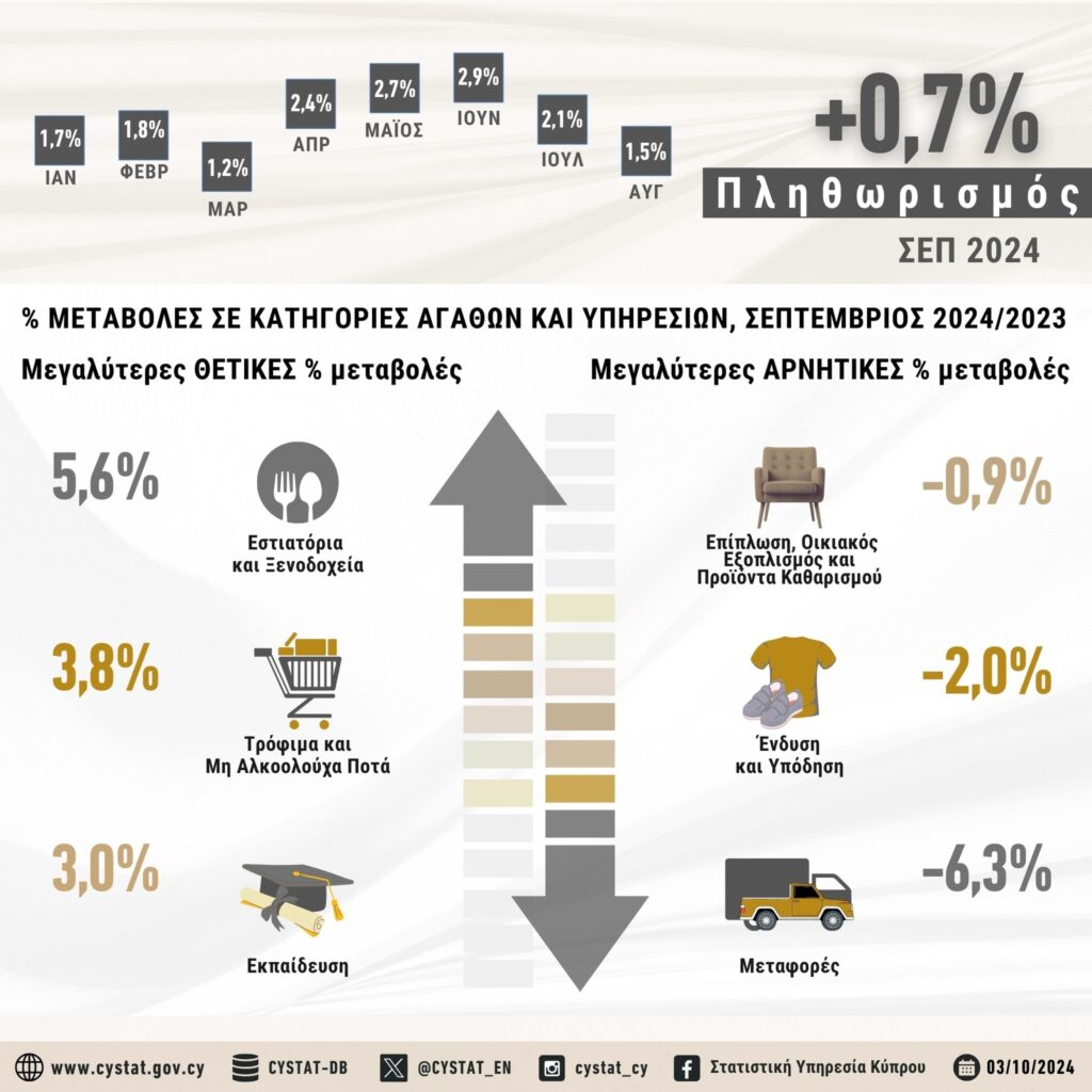 Συγκριτικά με τον Σεπτέμβριο του 2023, η μεγαλύτερη αύξηση παρατηρήθηκε στην κατηγορία Εστιατόρια και Ξενοδοχεία (5,6%) και η μεγαλύτερη μείωση στις Μεταφορές (-6,3%).